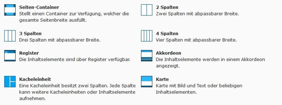 Mit Strukturelementen können Seitenbereiche feiner unterteilt werden. Typische Strukturelemente sind Spalten, Container, Register und Akkordeon.