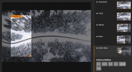 Damit die Bildausschnitte für die Kacheln schneller definiert werden können, wurde dem Bildausschnittsdialog die Seitenverhältnisse 2:1 und 1:2 hinzugefügt. Zur optimalen Bildausgabe können die Bildgrössen skaliert werden (siehe Seite Inhaltselemente-Bilder).