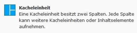 Eine Kacheleinheit besteht aus zwei Spalten. In einer Spalte können weitere Kacheleinheiten oder ein Inhaltselement untergebracht werden. Wird ein Inhaltselement eingefügt, so kann diesem das Kachelseitenverhältniss über die Layoutsauswahl zugewiesen werden.